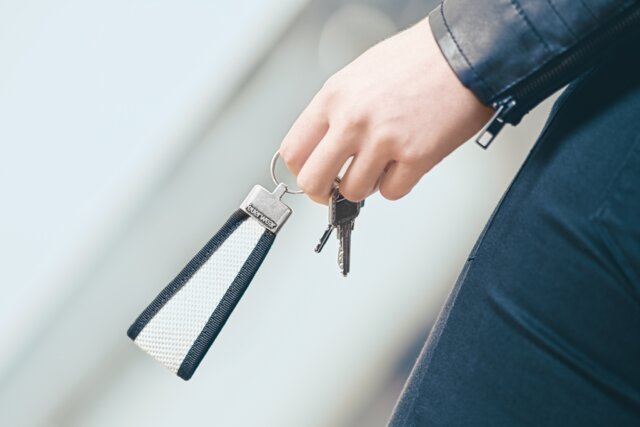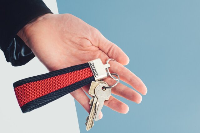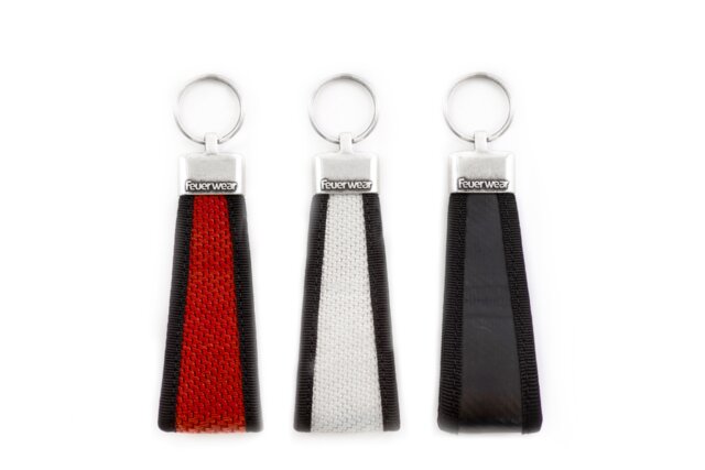 Die Schlaufe aus Feuerwehrschlauch sorgt für festen Griff – auch wenn es schnell gehen muss. Der stabile Metallring bietet Platz für mehrere Schlüssel und hält sie sicher an einem Ort.