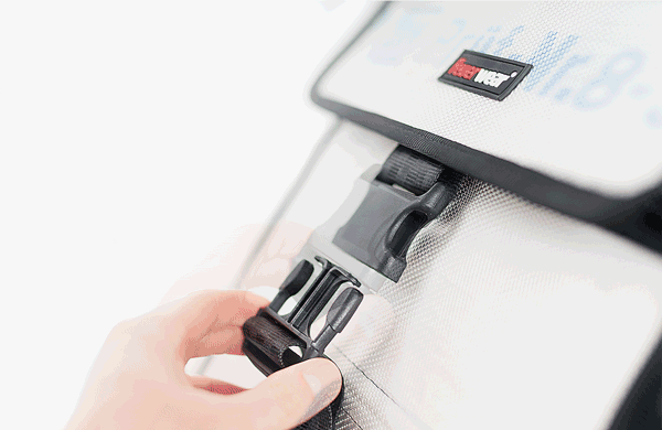 Die stabile Schnalle öffnest und schließt du einhändig. Der längenverstellbare Gurt hält den Rucksack sicher zusammen – auch wenn er voll beladen ist.
