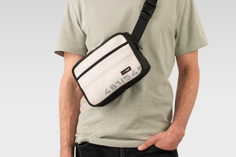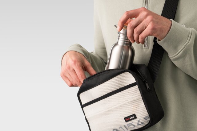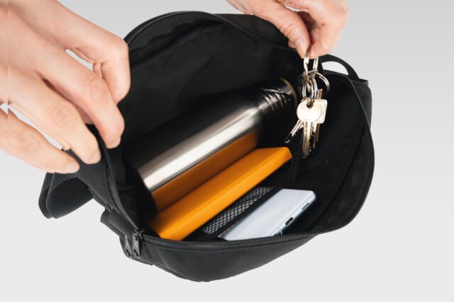 Im Hauptfach finden Smartphone, Portemonnaie, Schlüssel und sogar eine kleine Flasche Platz. Vorn hält ein Reißverschlussfach Kleinigkeiten griffbereit. Hinten bietet ein weiteres Fach schnellen Zugriff.